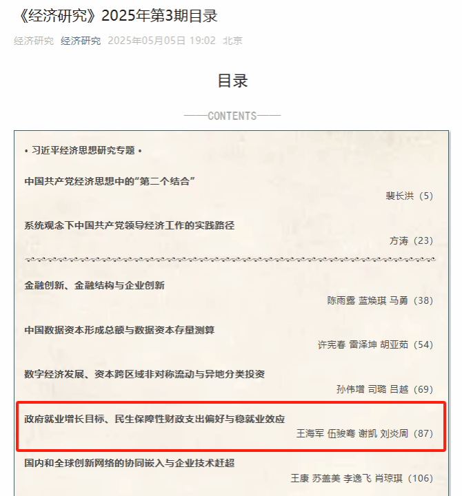 我校金融学院金融学专业2020级博士研究生王海军(2024年6月毕业后就职于中国西部经济研究院),与中国西部经济研究院伍骏骞教授、经济与管理研究院西方经济学专业博士研究生谢凯、中国西部经济研究院刘炎周讲师(通讯作者)合作完成的学术论文《政府就业增长目标、民生保障性财政支出偏好与稳就业效应》在《经济研究》2025年第3期刊出。