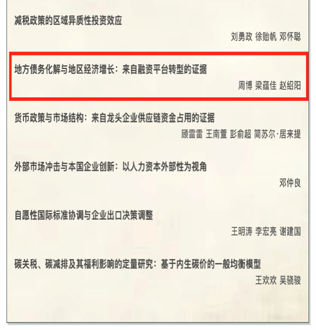 我校经济学院西方经济学专业2021级博士研究生周博(2025年6月毕业后就职于北京大学经济学院),与四川大学经济学院博士研究生梁蕴佳(通讯作者)、四川大学经济学院赵绍阳教授合作完成的学术论文《地方债务化解与地区经济增长:来自融资平台转型的证据》在《经济研究》2025年第5期刊出。